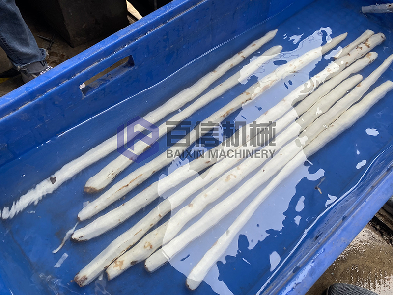 設備啟動后將山藥從入料口處投入,通過送料機構自動帶動白蘿卜向前移動的同時經過切刀組合進行去皮加工。